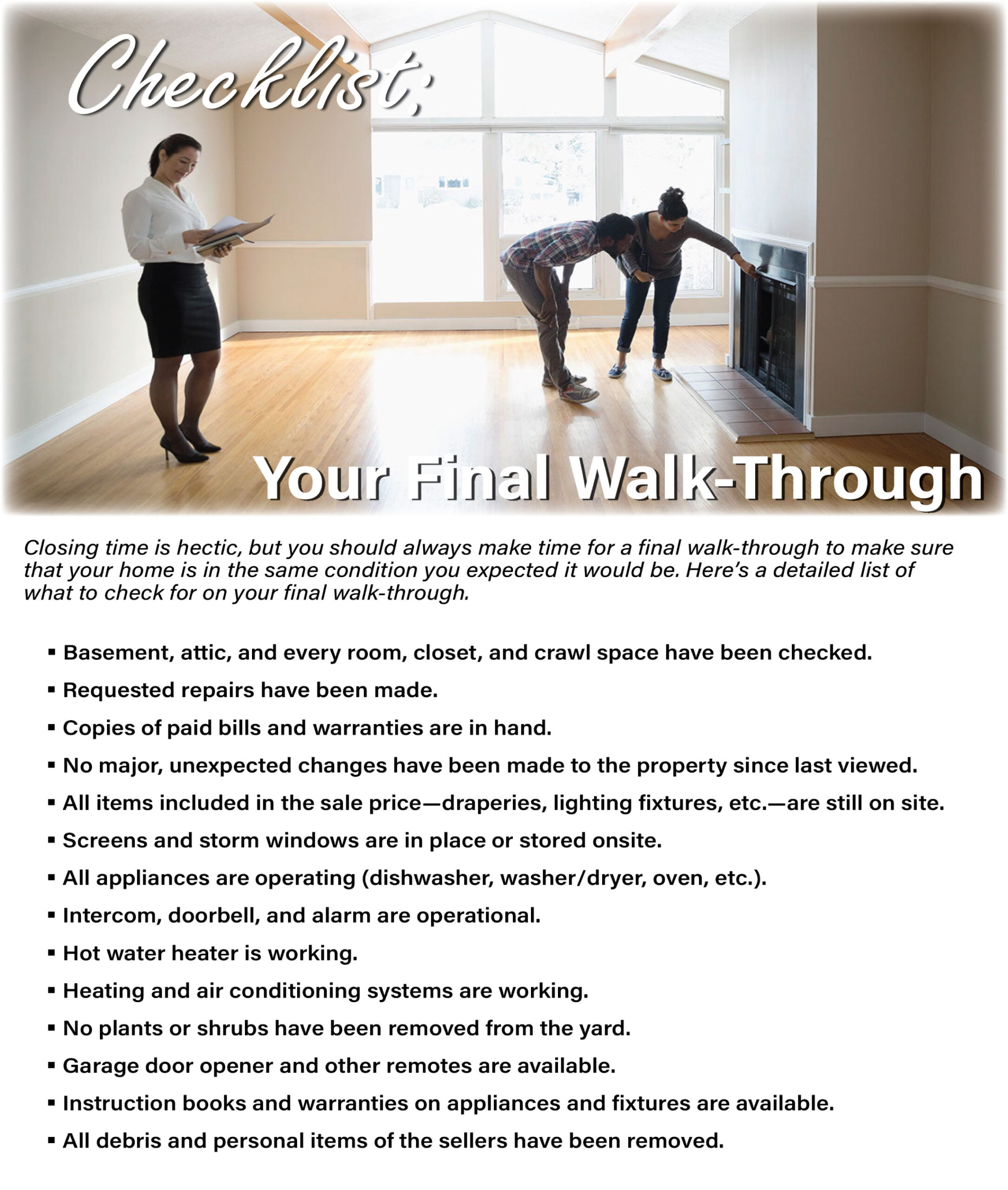 Ensure a smooth closing with our final walk through checklist form. This checklist does not affect any terms of the agreement signed during previous home inspection. Basement, attic, and every room, closet, and crawl space have been checked. The goal of a final walkthrough is to give you, the buyer, an opportunity to do one last check before closing on.
